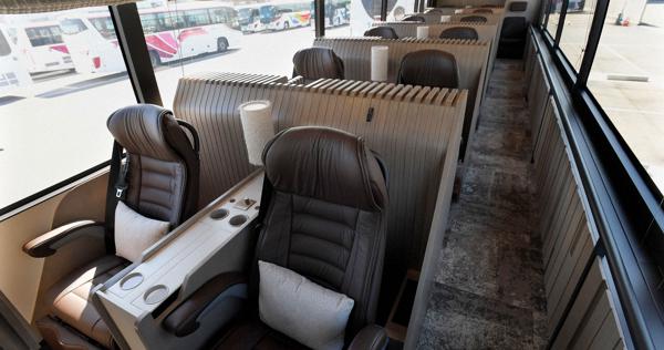 - 今回導入する車両は、乗車定員12名(2名掛けシート×6列)で、「One-Seat HOTEL」をコンセプトに、壁面・収納スペースには大川家具を、座席には高級本革を使用したドイツ直輸入のシートを採用し、ホテルのようにくつろげる上質な空間を演出します。福岡~東京間を結ぶ日本最長の高速バス「はかた号」など多くのバスを運行してきたノウハウを活かし、移動における快適さを追求した車両です。